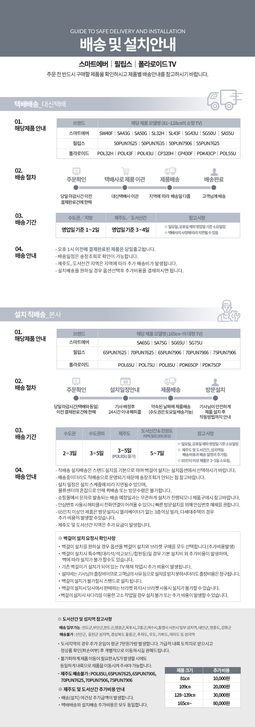 - 단, 50인치 이하 제품의 경우에도 방문설치 옵션을 구매하시면 설치기사가 방문하여 직접배송해 드립니다.