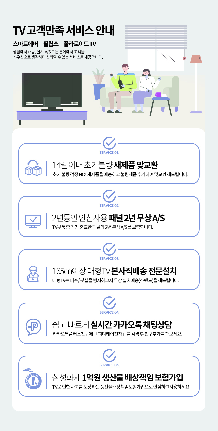 - TV제품의 직접배송 제품 및 방문설치 옵션 구매시, 고객님께 해피콜을 드려 제품확인 및 방문일정을 확인하여 드립니다.