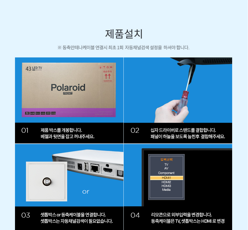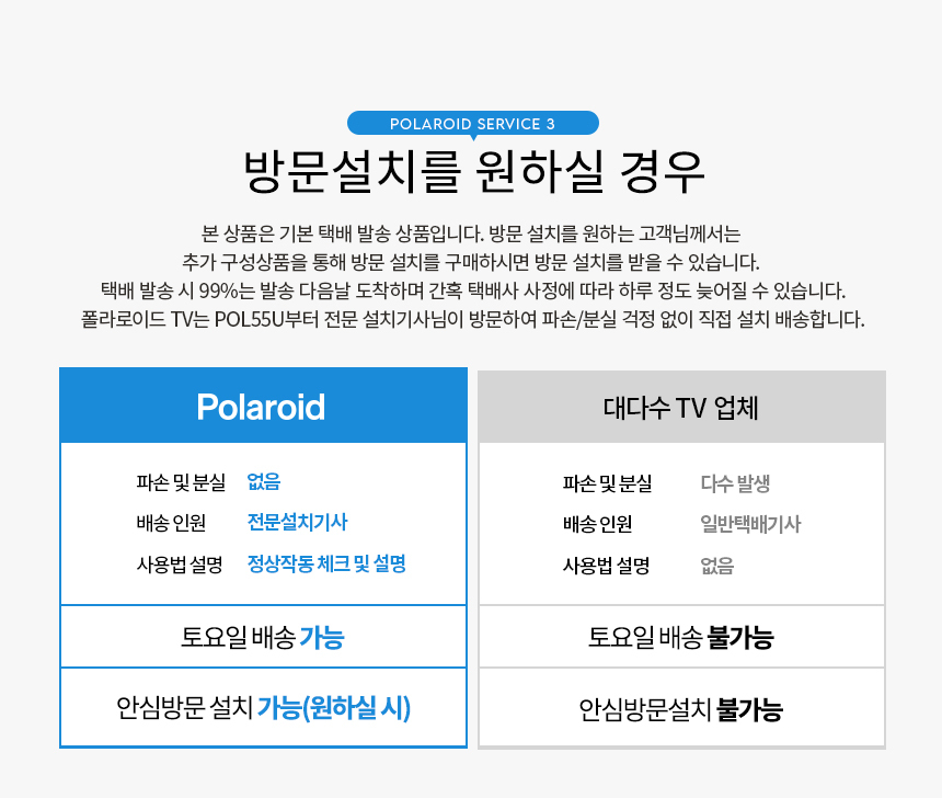 - TV제품의 직접배송 제품 및 방문설치 옵션 구매시, 고객님께 해피콜을 드려 제품확인 및 방문일정을 확인하여 드립니다.
