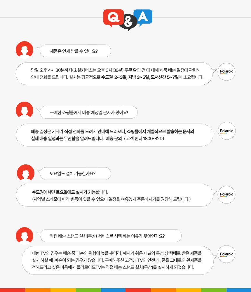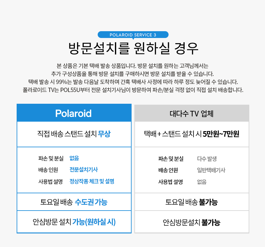 - TV제품의 직접배송 제품 및 방문설치 옵션 구매시, 고객님께 해피콜을 드려 제품확인 및 방문일정을 확인하여 드립니다.