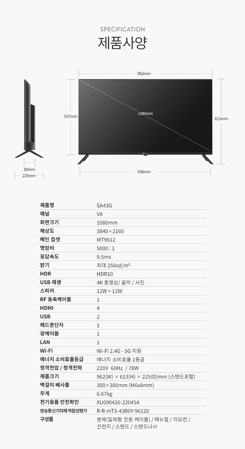 | KC 안전 인증 | [전기용품] 안전확인 대상 품목으로 아래의 국가 통합인증 필함.인증번호 : XU090426-20026A(해당 인증 검사 정보는 판매자가 직접 등록한 것으로 등록 정보에 대한 책임은 판매자에게 있습니다.) |