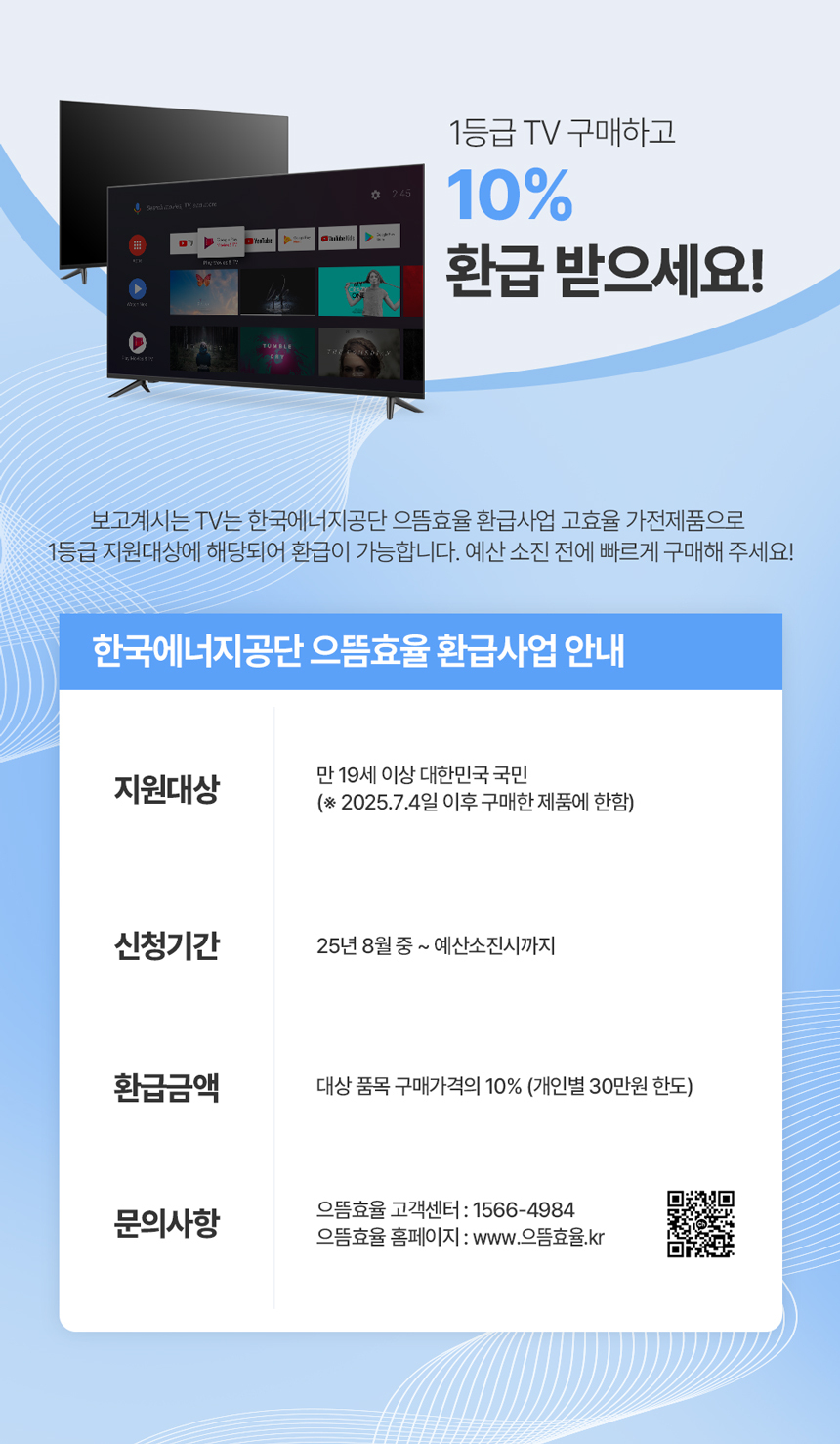- TV제품의 경우 50인치 이하 제품은 택배배송, 55인치 이상제품은 직접배송(스탠드설치)합니다.